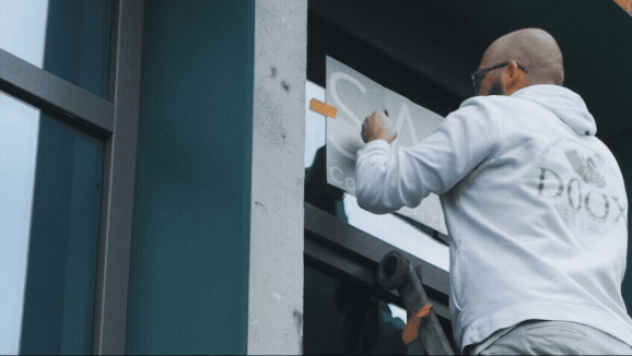 Pose de vinyle SACE Entreprendre sur façade – grand format